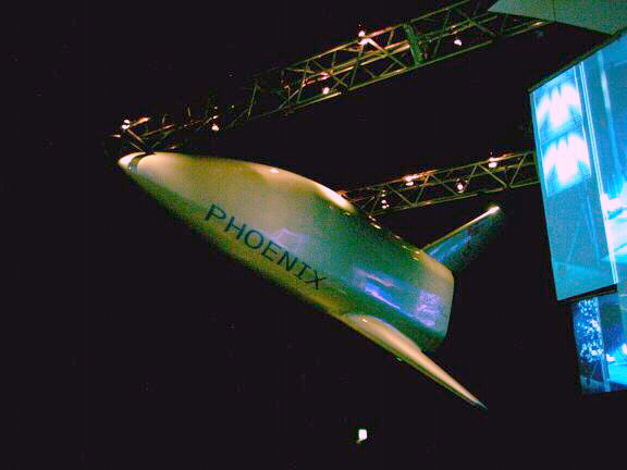 1:1 Mockup des PHOENIX hängt einsam in einer Halle an der Decke Foto: © 2004 NAFS |