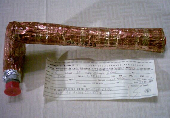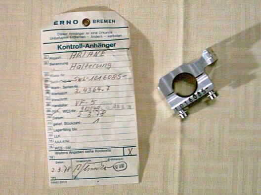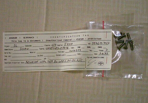 : Schrauben von SPACELAB, gefolgen auf der D2-Mission mit Ausmusterungsbeleg.