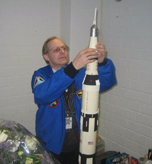 | Rechts: Vorbereitung der Modelle ( hier die SATURN V im Maßstab 1/96 ) für ihren "Auftritt". |