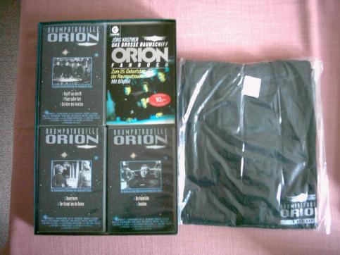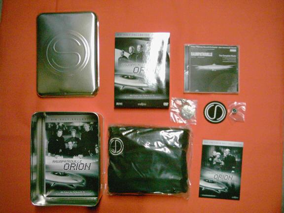 Der Inhalt: die 3 VHS Kassetten, das Fan-Buch zum 25 Geburtstag von Raumpatrouille von Jörg Kastner, eine CD mit dem Soundtrack, ein riesen Poster und ein T-Shirt |