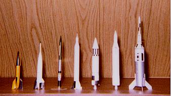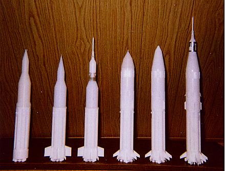 Einige frühe Raketen ( v.l. ) V2 No. 2, Bumper, Vanguard, Jupiter C & Explorer I, Jupiter, Juno II und Little Joe 2 ( alle im Maß- stab 1/144 ) |