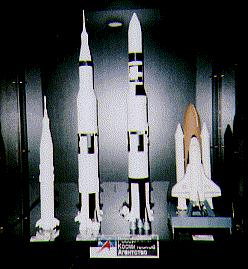 einige Trägersysteme der bemannten Raumfahrt v.l. Saturn 1b, Saturn V - APOLLO, Saturn - Skylab und Space-Shuttle with Booster- Rockets ( alle im Maßstab 1/144 ) |
