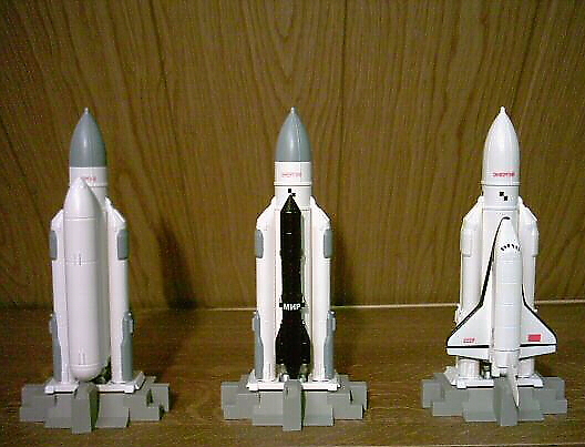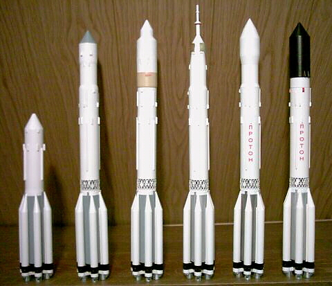 Links: einige Varianten der russische Trägerrakete PROTON: (v.l.) Proton I, Vega, MIR, Zond, Commercial-Proton und Proton Zarya. ( Maßstab 1/144 ) |