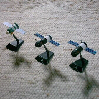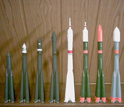 auf Basis der R-7: (v.l.) Sputnik I, Luna, Vostok, Voschod II, Sojus, Progress,