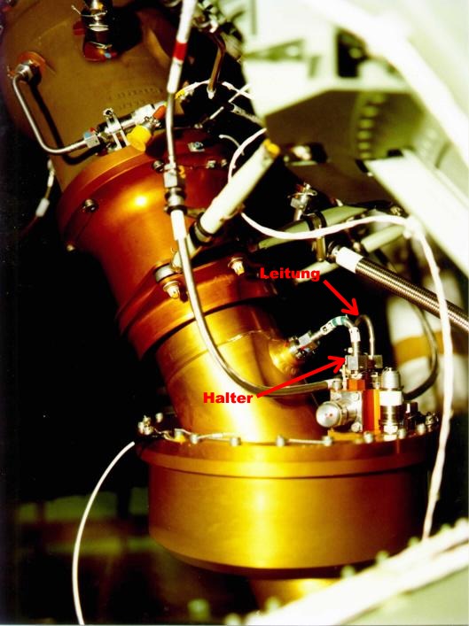 Einbaulage der Leitung und des Halters. Die Leitung gehört zum Steuersytem der Treibstoffzuführung und ist hier auf dem gelben Mischgehäuse im unteren Teil rechts zu erkennen ebenso wie der Halter.