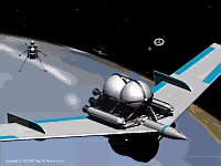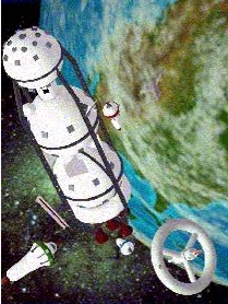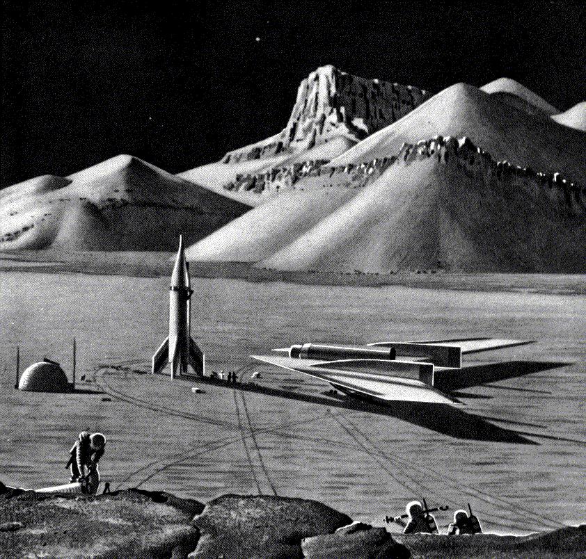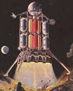 Aber es gab nicht nur Projekte für die Erforschung des erdnahen Weltraums, auch über die Reise zum Mond und Mars hatte man sich Gedanken gemacht, die sich in folgenden Entwürfen nieder schlugen. Für die Erforschung des Mondes hatte man Pläne für einen Lunar-Lander entwickelt, der im Erdorbit ( von der Raumstation aus ) gebaut werden sollte und auch von hier seine Reise zum Mond antreten würde. Nach erfüllter Mission war vorgesehen zur Raumstation zurück zu fliegen und den Lander dort zu parken. Für die direkte Rückkehr zur Erde war der Lander nicht ausgelegt. Anders als das spätere LM der Apollo-Missionen war der Lunar-Lander ein einstufiges Fahrzeug von entsprechenden Dimensionen, da ja genügend Treibstoff für die Landung auf dem Mond und den Rückstart des gesamten Gerätes vom Mond sowie den Rückflug zur Raumbasis mitgeführt werden mußte. Auch gab es Pläne für ein Cargo-Ship das für die Versorgung einer Mondbasis vorgesehen war. |