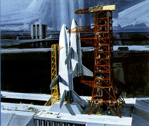 | Bild oben: künstlerische Darstellung eines vollständig wiederverwendbaren Raumtransport-Systems nach einem Entwurf von North American / Convair | Bild oben: Das Space-Shuttle wie es heute seinen Dienst tut. |