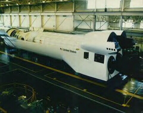 ![]() Bild oben: Das Mock-Up des Shuttle-C Orbital-Modules für den Transport von Bauteilen der Raumstation Freedom |