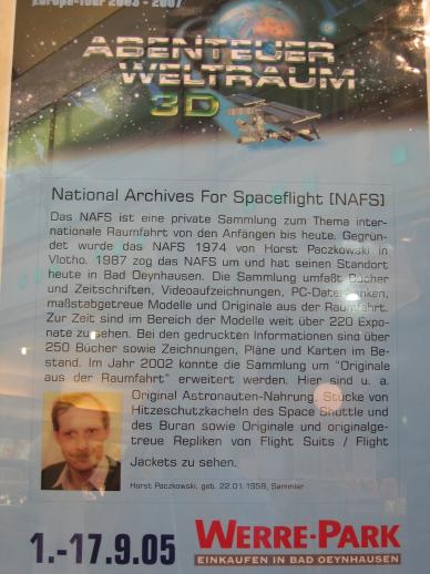 In der Zeit vom 1. September bis 17. September 2005 fand im Werre-Park Bad Oeynhausen die Ausstellung "Abenteuer Weltraum 3D" statt. Folgende Institutionen bzw. Personen waren an der Ausstellung beteiligt