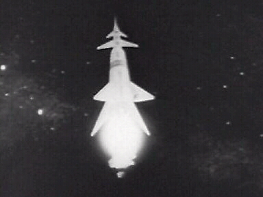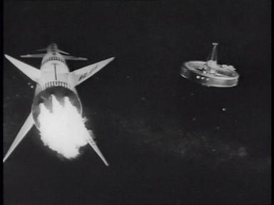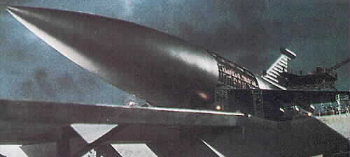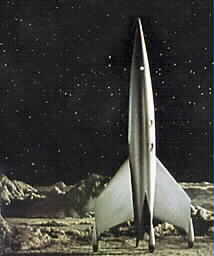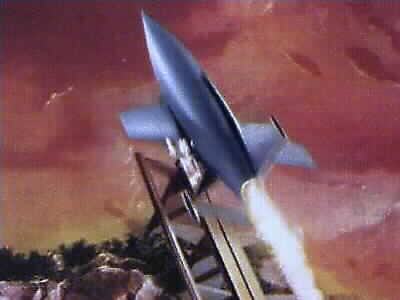 Die Form des Raumschiffs erinnert an eine Mischung aus A-4 ( V2 ) und Fi-103 ( V-1 ). |